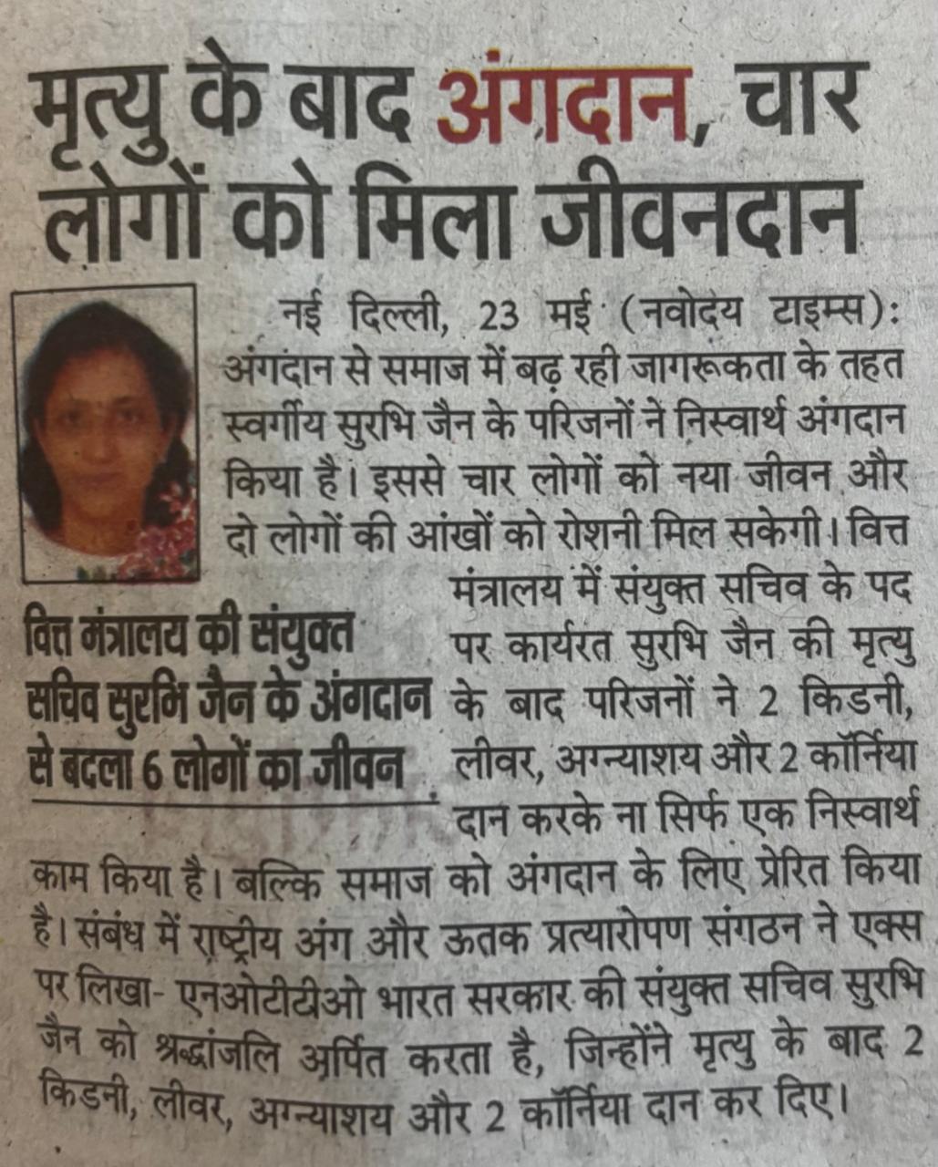 The Dadhichi Deh Dan Samiti (DDDS) salutes the extraordinary and selfless decision made by the family of Smt. Surbhi Jain, fulfilling her wish to donate vital organs after she was declared brain dead. Just a month before her untimely passing, Smt. Jain had a thoughtful and inspiring conversation with Shri Ashok Aggarwal, Zonal Convener of DDDS, in which she expressed a deep understanding of and commitment to the noble causes of body and organ donation. Tragically, following her sudden demise, her family made the courageous and compassionate decision to donate her organs in service of humanity.