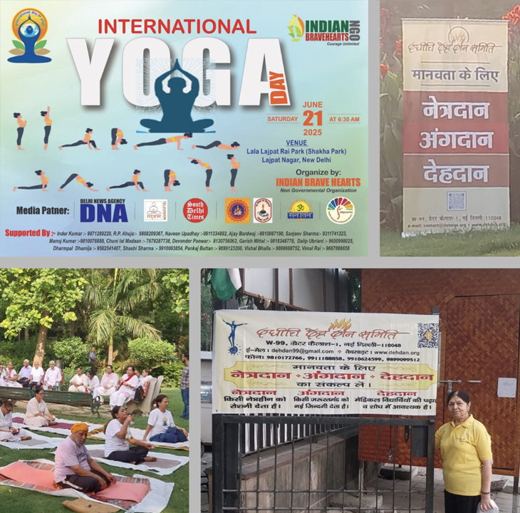 अंतर्राष्ट्रीय योग दिवस के उपलक्ष्य में, इंडियन ब्रेव हार्ट (एन.जी.ओ.) द्वारा लाला लाजपत राय पार्क (शाखा पार्क), लाजपत नगर, नई दिल्ली में एक कार्यक्रम का सफल आयोजन किया गया। इस कार्यक्रम में दधीचि देहदान समिति (दक्षिण विभाग) ने भी अपनी उपस्थिति दर्ज कराई और जागरूकता स्टॉल लगाया।