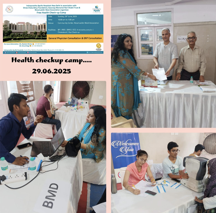 दिनांक 29 जून 2025 को कम्युनिटी सेंटर, निजामुद्दीन वेस्ट, दिल्ली में इंद्रप्रस्थ अपोलो अस्पताल, श्री चतुर्भुज फाउंडेशन और स्वरूप मेमोरियल नारी शक्ति ट्रस्ट ने संयुक्त रूप से एक विशाल हेल्थ चेक-अप कैंप का सफल आयोजन किया।
